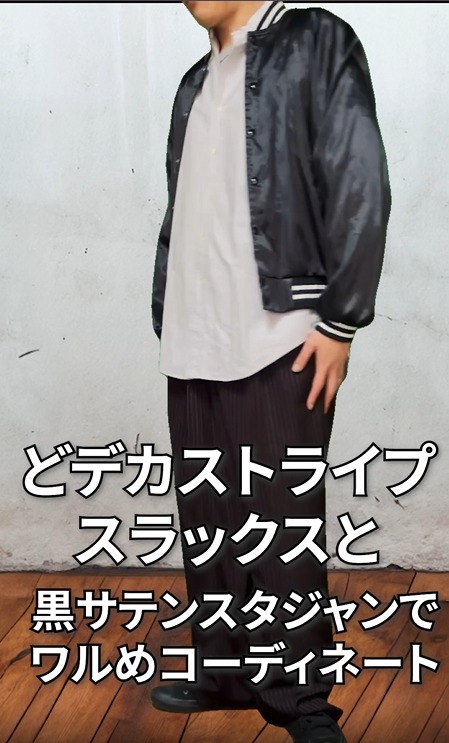今回の主役は、90sの雰囲気が漂うHART WELLのサテンスタジャン。これに太めのストライプパンツを合わせることで、今のストリートに映えるシルエットを作りました。