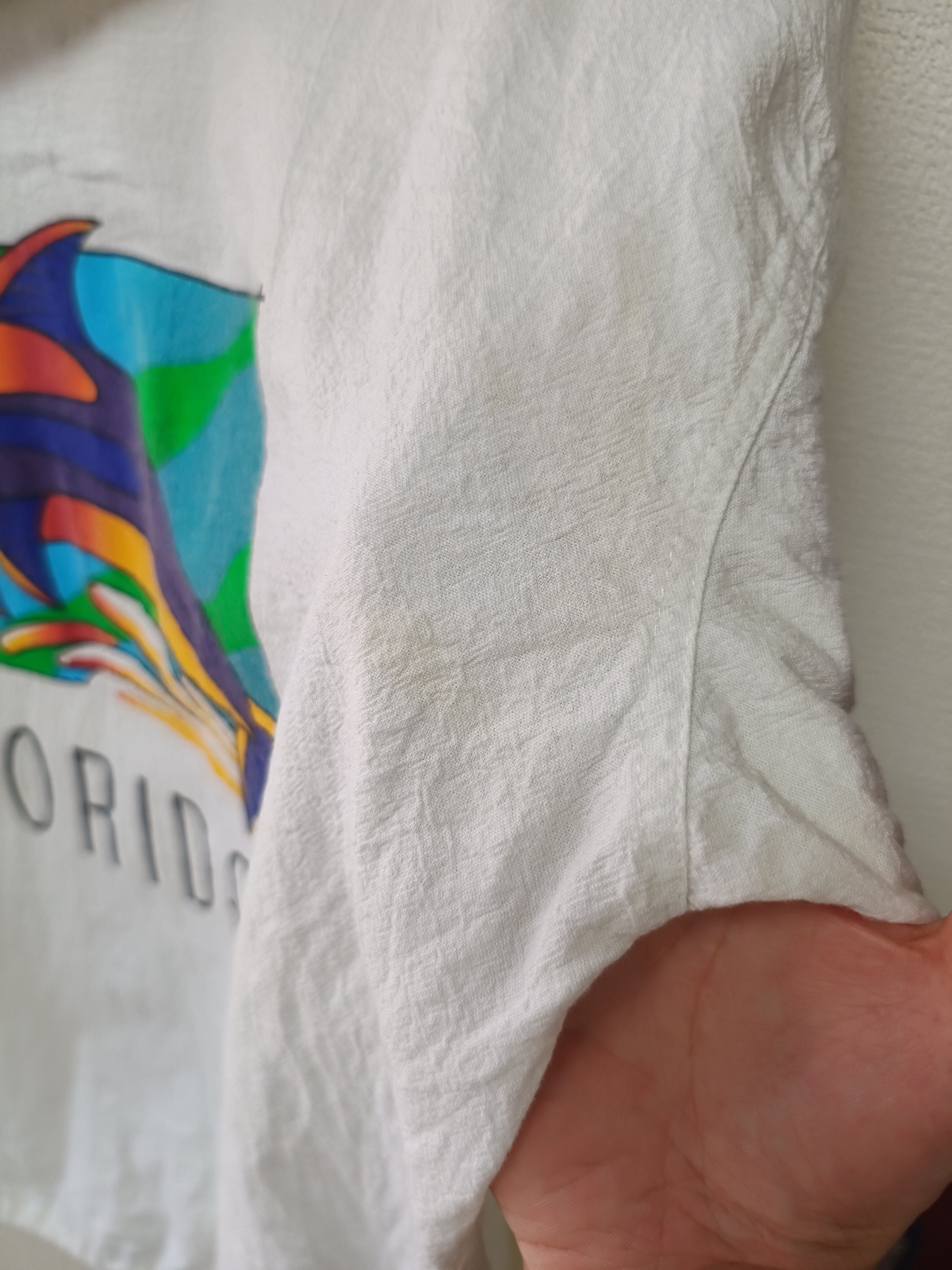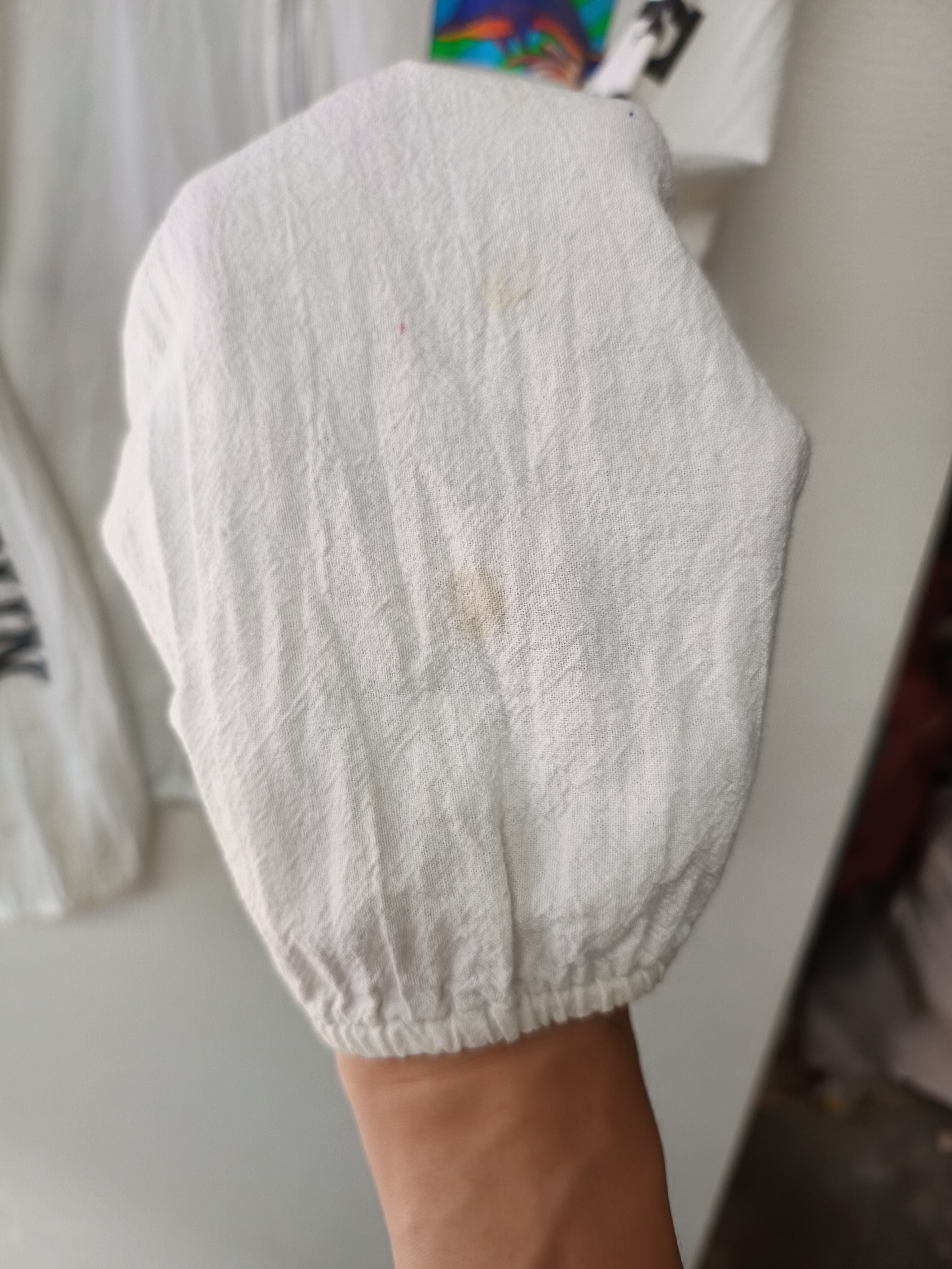 袖部分に汚れがあります。脇部分に薄めのシミがございます。